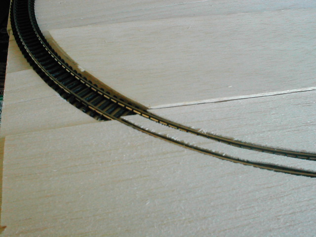 As I was limited for time, I made the baseboard entirely from Balsa. It helps that I keep a good supply of it in the shop. Apart from this convenience, balsa is suitable for small or quick jobs because it is easy to cut with a knife (or even scissors for the thinner pieces) and small nails or track pins can be pushed in by hand. With little material to work from apart from having seen trailers for the movie most of the year (2004) and a few pictures on posters, I decided to make a layout including a street scene where the train arrives outside the boy's home during the night, and also the impossibly steep and tightly curved track winding up a mountain. For obvious reasons, this section of track would have to be "fake". Having never seen the book the movie is based on, I figured these 2 scenes would be the easiest to incorporate into a working model. Only 4 days away from the movie's release on the 18th of November 2004, I laid the track. The photo above was taken on the 15th of November after much work to ease the grade and curves to allow a Spectrum US 2-8-0 steam locomotive to negotiate it. I realise now that I should've made the layout a few centimetres wider. But these things happen when you rush I guess. :-)