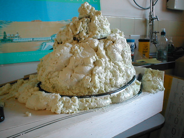 As this layout needed to be ready very quickly, I decided to try using the space-filling expanding foam material that comes in a spray can at hardware and building suppliers. I'd never used it before. It certainly is a quick (albeit, relatively expensive) way of producing scenery. However, I quickly discovered that it continues to expand quite some time after it has been sprayed. As a result, I was slightly alarmed to see that my tracks were being covered by the foam as it expanded.