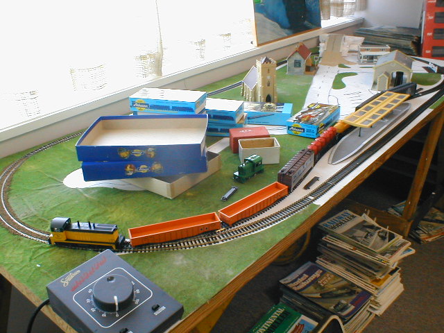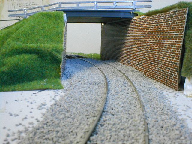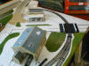 Scenery The next stage in building our layout is adding scenery. Since this is the quick and easy method of scenery construction, you'll be pleased to know that the grass in the pictures is in the form of a rolled mat with is simply placed on the board and glued down. I chose to cut the mat so that there was no grass under the track. This is easily done by placing it over the track and pressing it down to see the location of the rails. Cutting is then done with a craft or 'Stanley' knife. Roads were drawn onto the board, so the mat was cut away where the roads were to be placed too. Alternatively you can moisten the areas that you don't need grass and simply scrape it off. At the far end, a road bridge over the railway was created (click on thumbnails below). The road itself was made from thick card. Some Plastruct girders were used to create the bridge and some old slot-car crash barriers were used to create the side railings (not the best choice, but they were lying around and otherwise of no use). Polystyrene foam sheets were used to create the 'hill' that the bridge is on. The road is far too steep here, but there wasn't the space for a more realistic grade (It was an idea I came up with later). After the 'hill' was created, I simply covered the foam with the grass mat material. Brick card was used to represent retaining walls under the bridge.