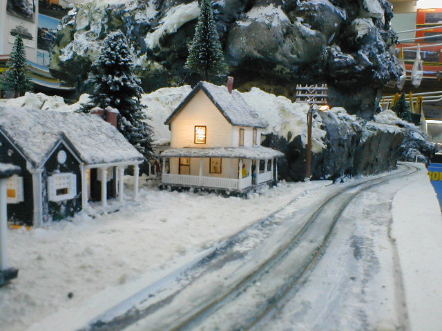 The snow material was provided by EFD Simply Glues and is called "Simply Snow". The layout, including buildings and trees were sprayed with scenic cement and the snow material sprinkled over the layout using a Woodland Scenics applicator. More glue was then sprayed over this and the process repeated a few times. Lighting was installed in the 3 houses (all Bachmann ready-to-use models) and also on the power poles as streetlights. Later coloured lights were put on one of the trees to resemble a Christmas tree.